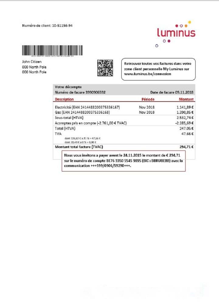 Belgium Luminus utility bill template in Word and PDF format (in .doc and .pdf format) download template file