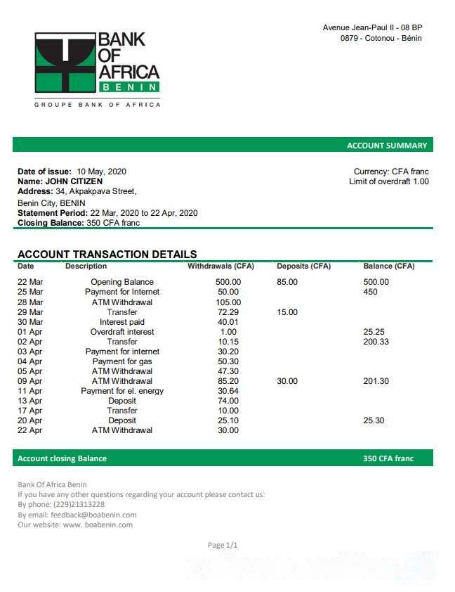 Benin Bank of Africa bank statement download template file