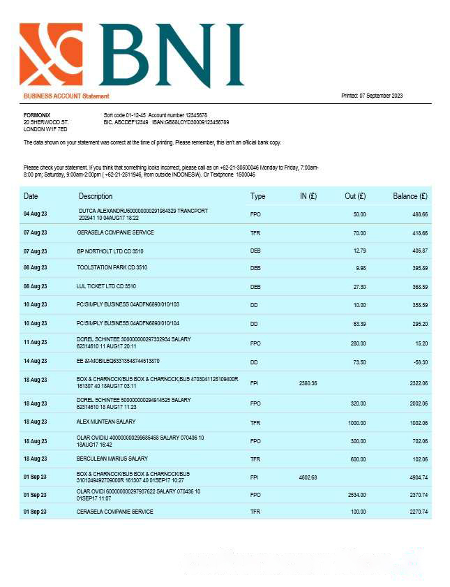 BNI Bank firm statement Word and PDF template download template file