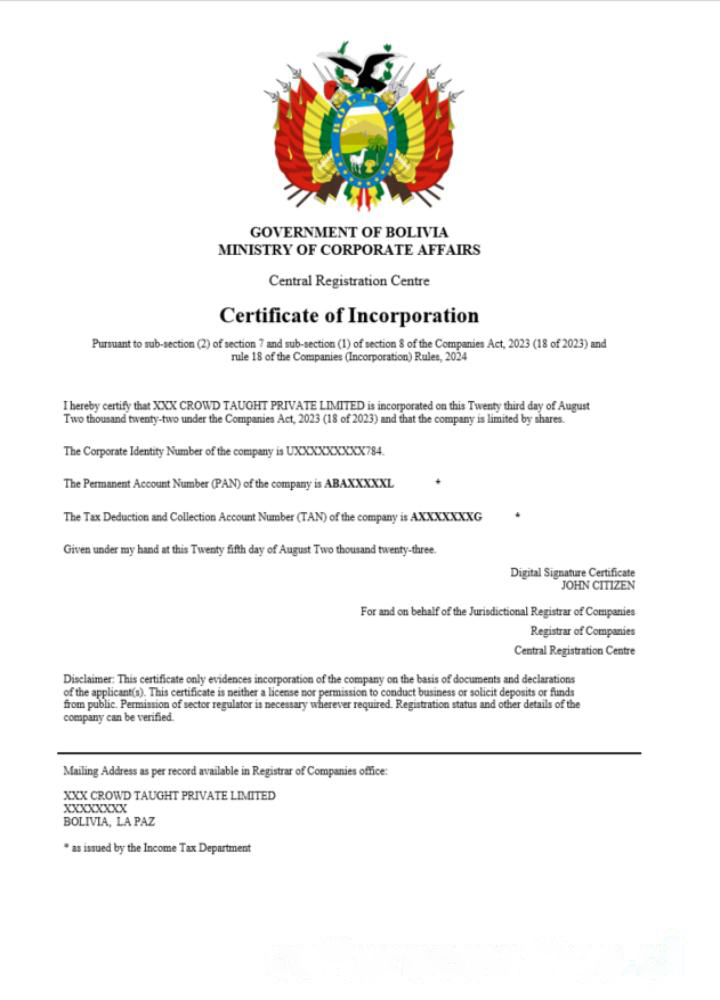 Bolivia certificate of registration Word and PDF template download template file