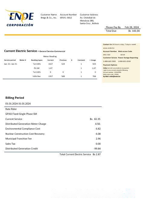 Bolivia ENDE Corporacion electricity business utility bill template in Word and PDF format download template file