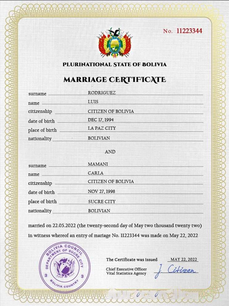 Bolivia marriage certificate download template file
