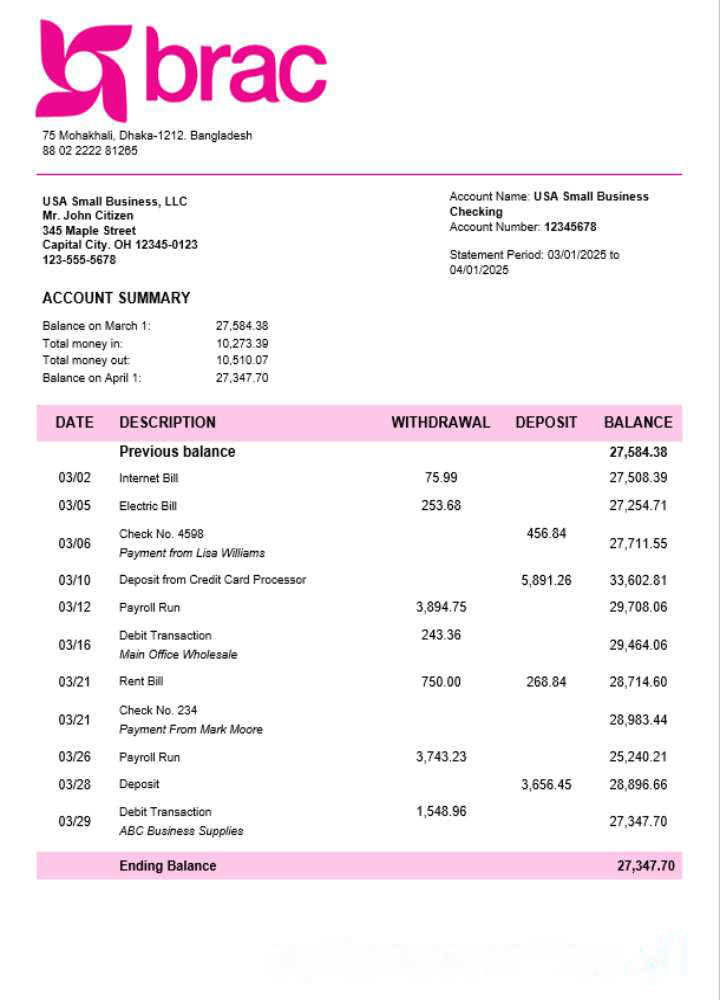 BRAC corporate checking account statement Word and PDF template download template file