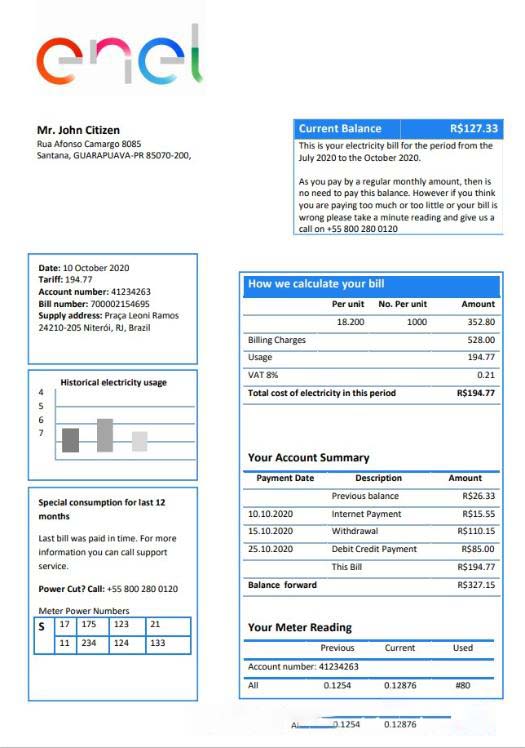 Brazil ENEL electricity utility bill template in Word and PDF format download template file