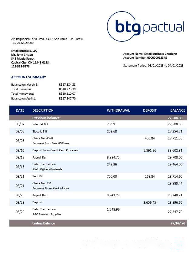 BTG Pactual Bank business checking account statement Word and PDF template download template file