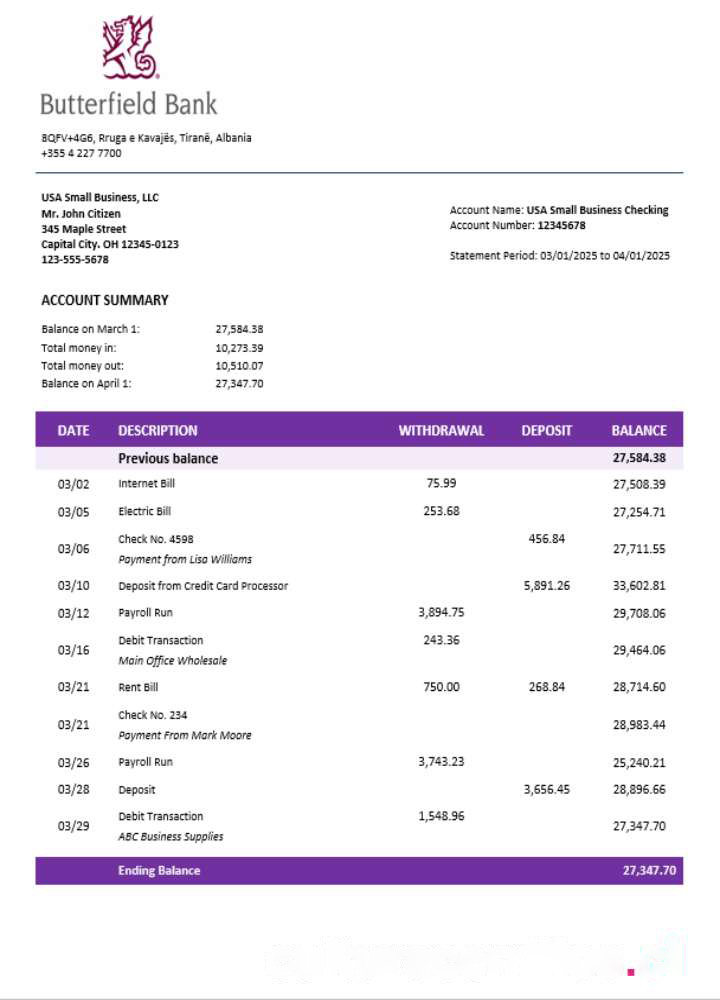 Butterfield bank organization checking account statement Word and PDF format download template file