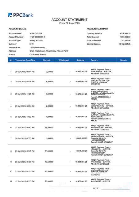 Cambodia PPCBank account statement Word and PDF template download template file