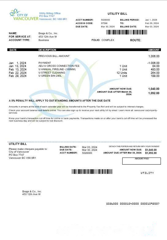 Canada British Columbia City of Vancouver business utility bill download template file