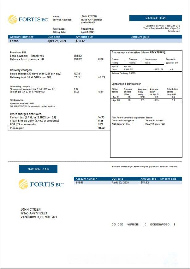 Canada British Columbia FortisBC utility bill template in Word and PDF format download template file