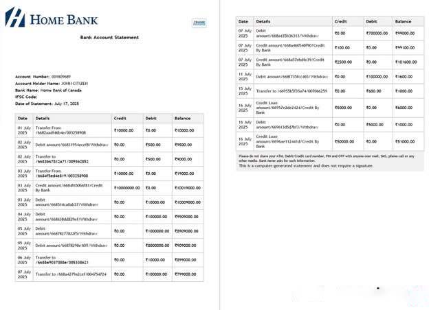 Canada Home bank of Canada account statement Word and PDF template, 2 pages download template file