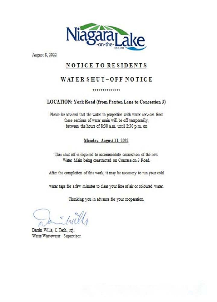 Canada Ontario The Niagara on the Lake water utility shut off notice download template file