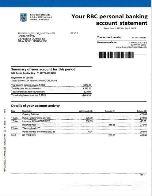 Canada Royal Bank of Canada account statement Word and PDF template download template file