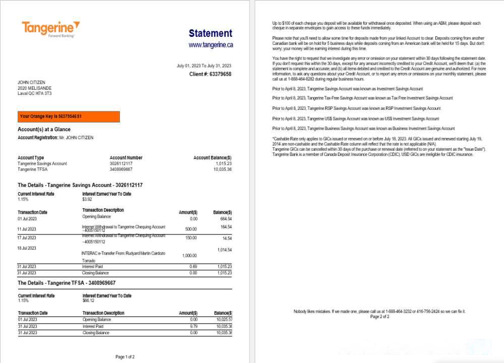 Canada Tangerine bank statement Word and PDF template download template file