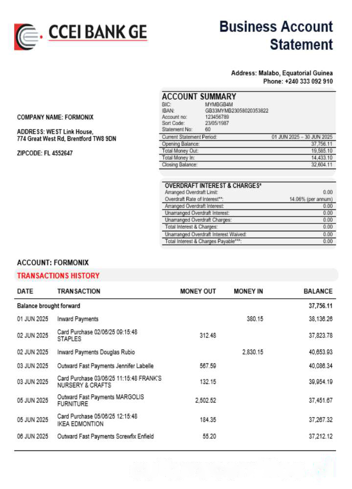 CCEI Bank business company account statement Word and PDF format download template file