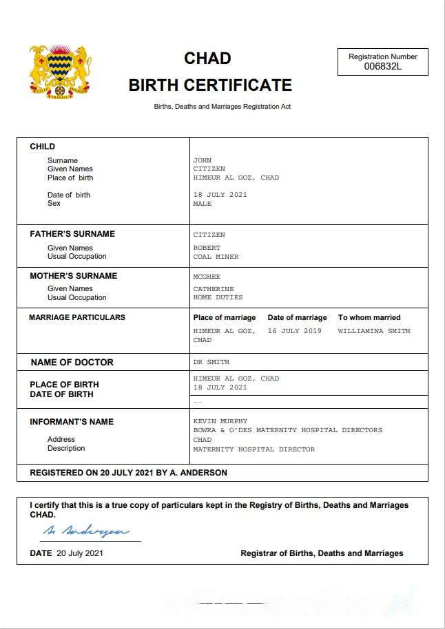 Chad birth certificate Word and PDF template download template file