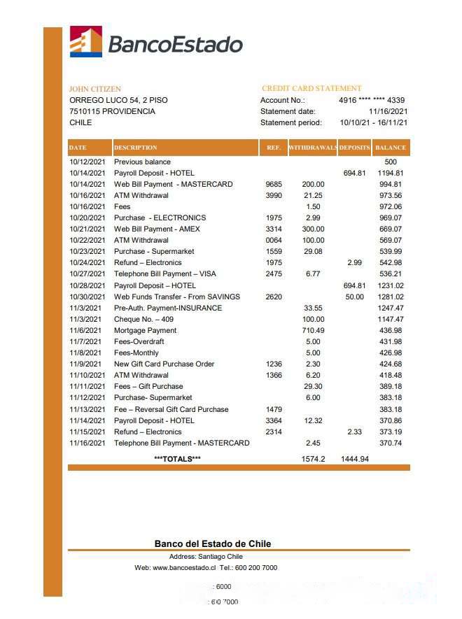 Chile Banco del Estado de Chile bank statement easy to fill template in .xls and .pdf file format download template file