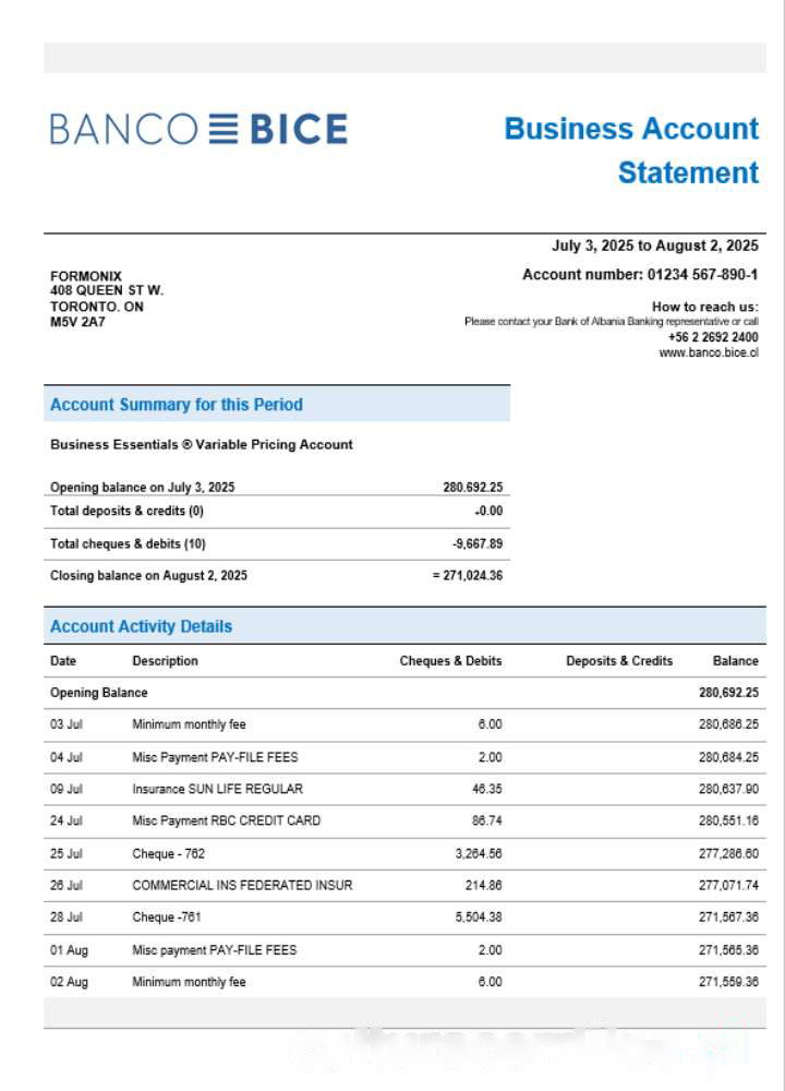 Chilean Banco Bice business firm account bank statement Word and PDF format download template file