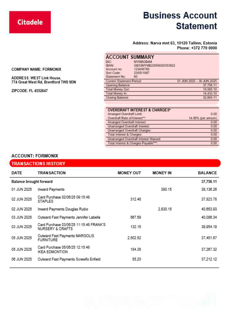 Citadele banka Eesti filiaal AS business account statement Word and PDF template download template file