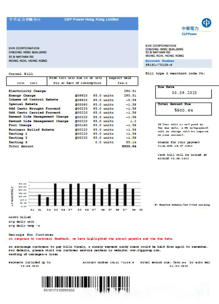 CLP Power Hong Kong Limited utility business bill, SCR download template file