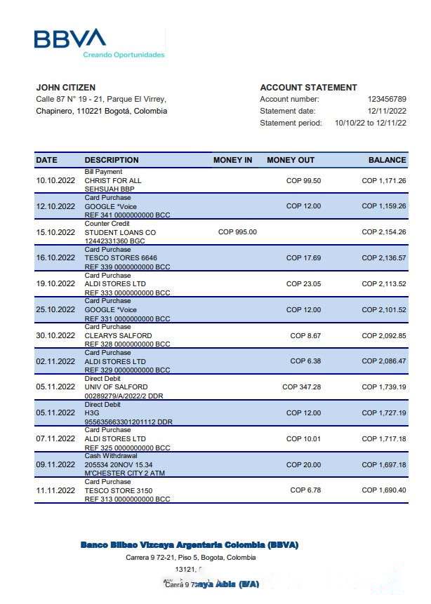 Colombia BBVA bank staement xls download template file