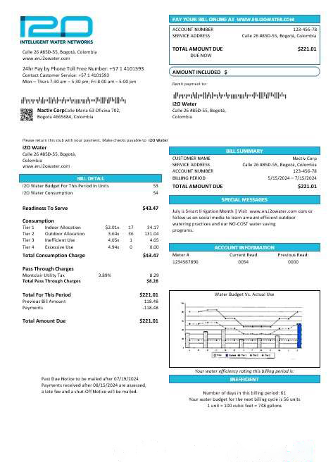 Colombia i2O Water business utility bill template in Word and PDF formats download template file