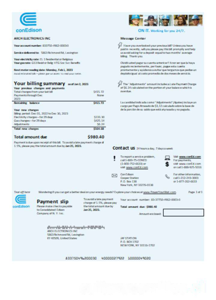 Con Edison electricity utility business bill SCR download template file