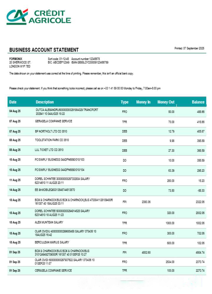 Credite Agricole company checking account statement Word and PDF template download template file