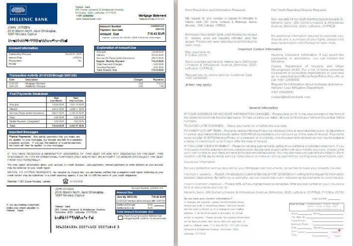 Cyprus Hellenic bank mortgage statement, 2 pages, 1 2 scr download template file