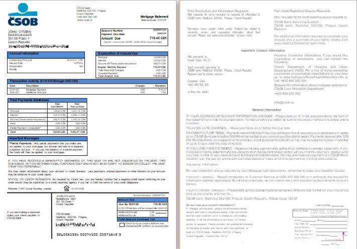 Czech ČSOB bank mortgage statement, 2 pages, 1 2 scr download template file