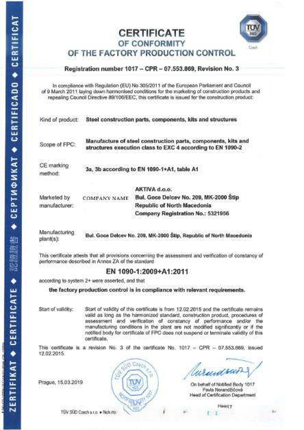 Czech Republic Certificate of Conformity of The Factory Production Control download template file