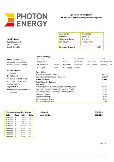 Czech Republic Photon Energy business utility bill template in Word and pdf formats download template file