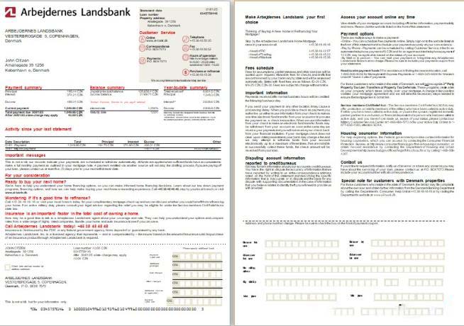 Denmark Arbejdernes Landsbank bank mortgage statement, 2 pages, 1 2 scr download template file