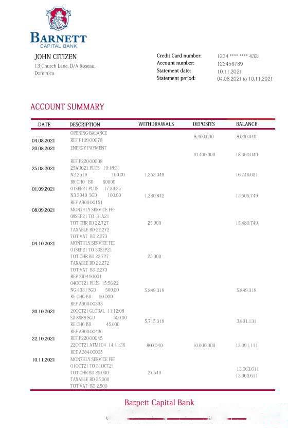 Dominica Barnett Capital bank statement template in Word and PDF format download template file