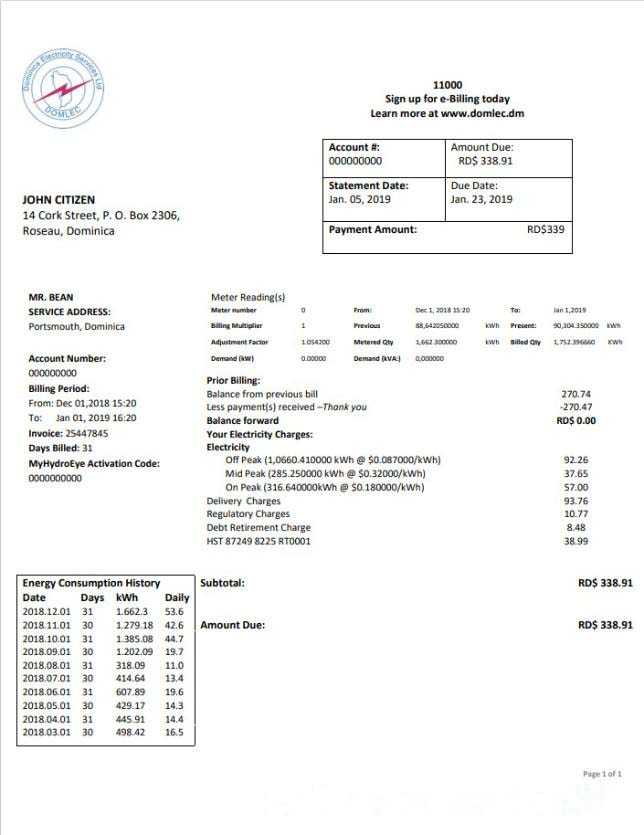 Dominica Electricity Services Limited electricity utility bill template in Word and PDF format download template file