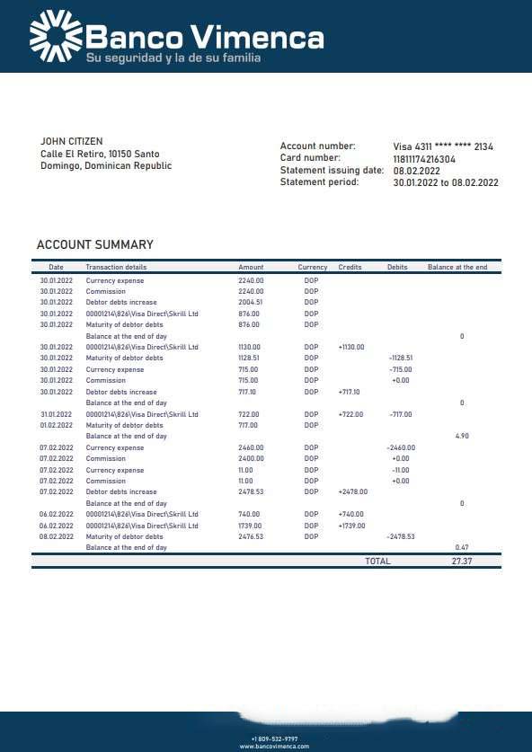 Dominican Republic Banco Vimenca bank statement template, Word and PDF format download template file