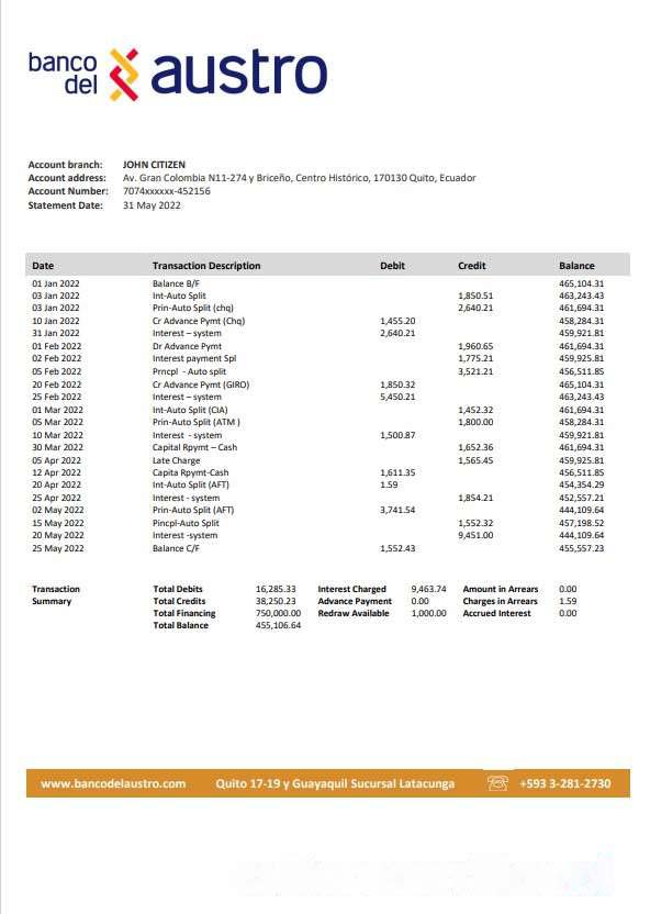 Ecuador Banco del Austro bank statement template, Word and PDF format download template file