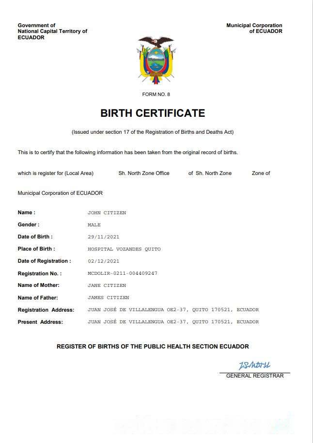 Ecuador vital record birth certificate Word and PDF template download template file