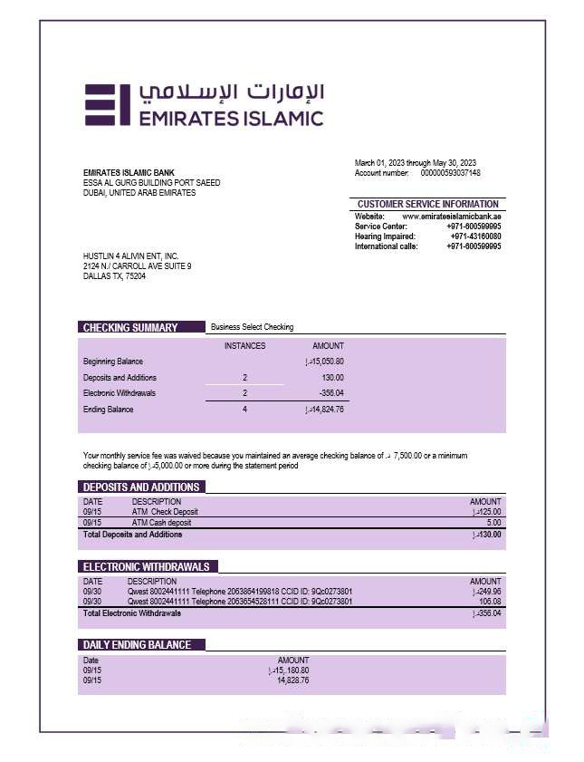 Emirates Islamic Bank firm account statement Word and PDF template download template file