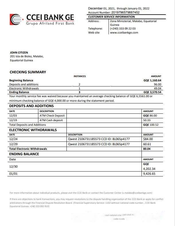 Equatorial Guinea CCEI Bank statement template, Word and PDF format download template file