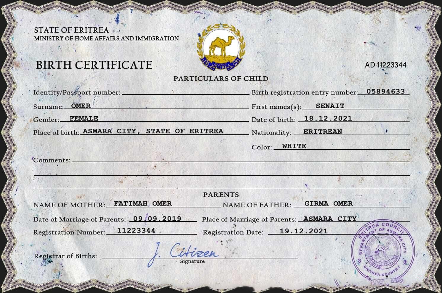 Eritrea vital record birth certificate PSD template download template file