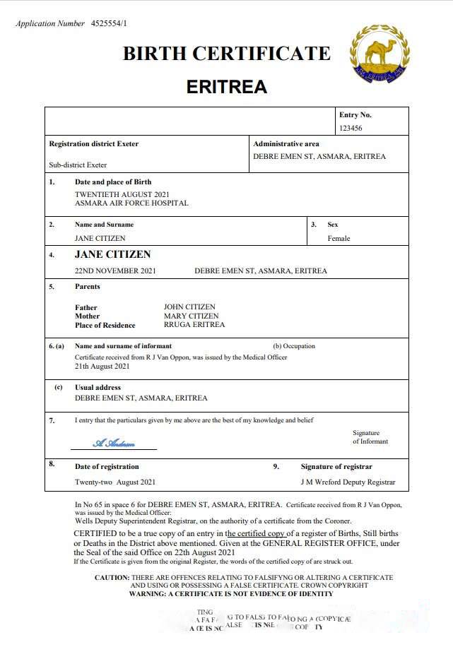 Eritrea vital record birth certificate Word and PDF template download template file