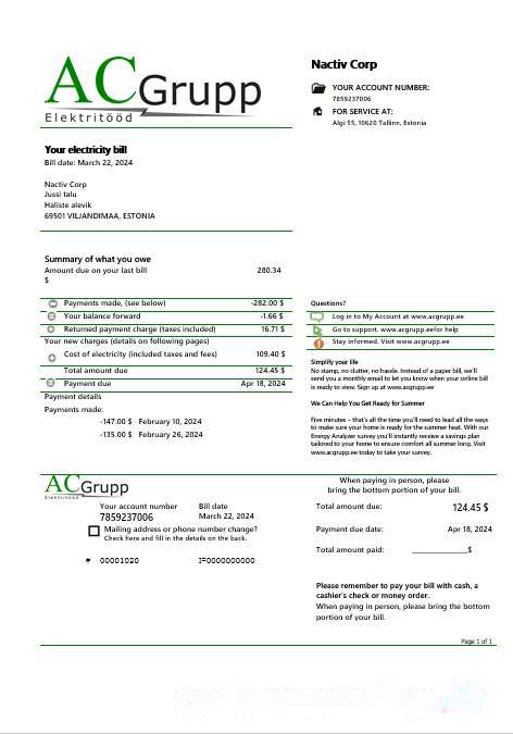 Estonia AC Grupp OÜ electricity business utility bill template in Word and PDF formats download template file