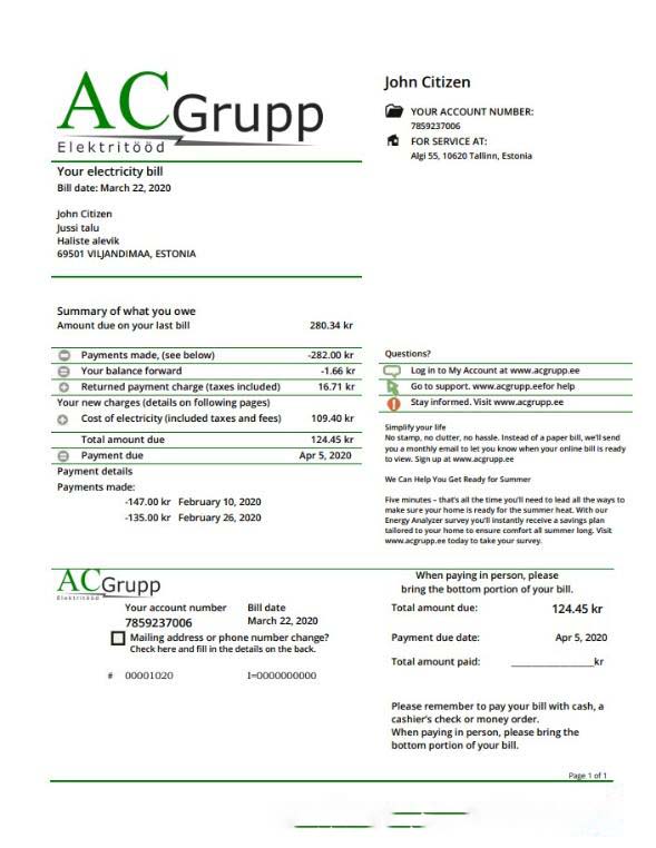 Estonia AC Grupp OÜ electricity utility bill template in Word and PDF format download template file