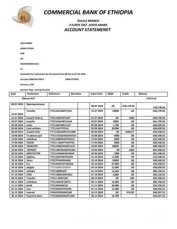 ETHIOPIA COMMERCIAL BANK OF ETHIOPIA Bank statement template, Word and PDF format, version 2 download template file