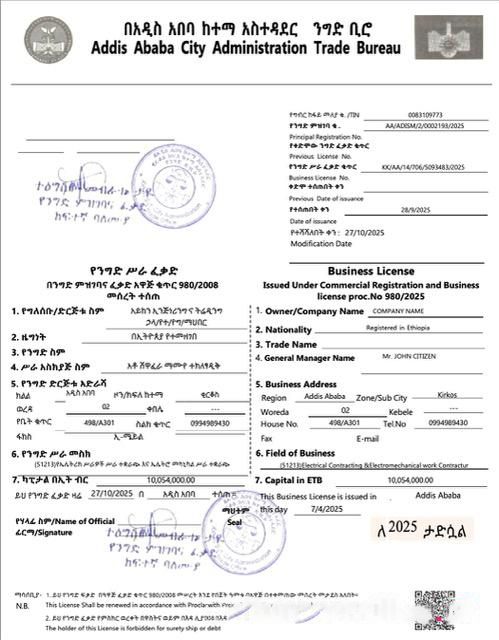 Ethiopia?Addis Ababa?business license Word and PDF template download template file
