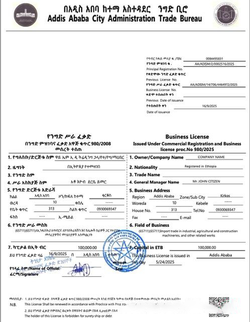 Ethiopia?Addis Ababa?business license Word and PDF template, version 2 download template file