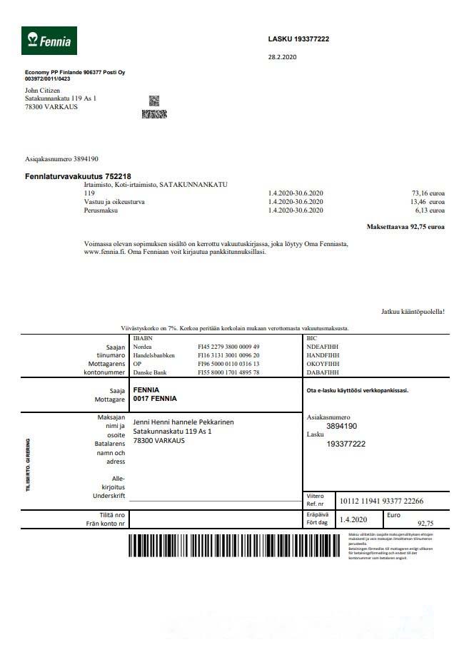 Finland Fennia Insurance company bill template in Word and PDF format download template file