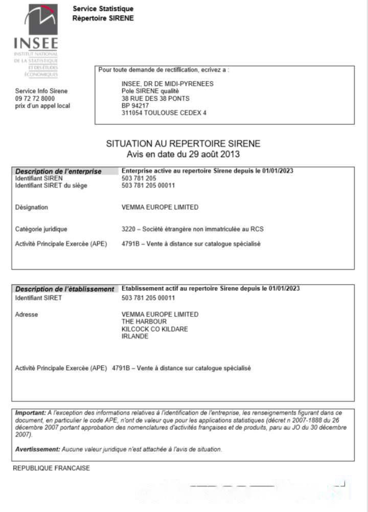 France INSEE registration certificate Word and PDF template download template file