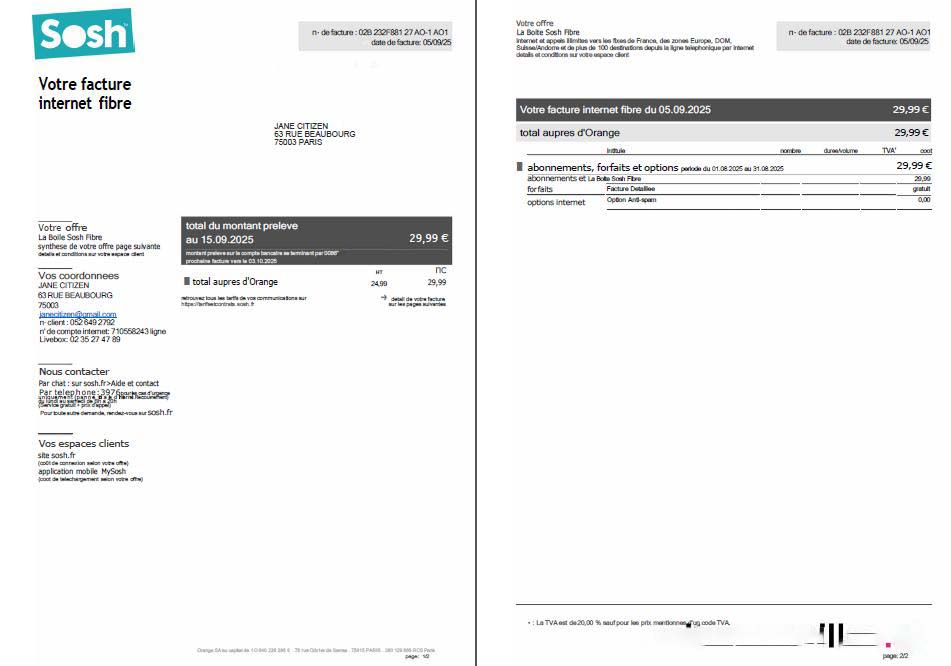 France Sosh utility bill template in Word and PDF formats, 2 pages download template file