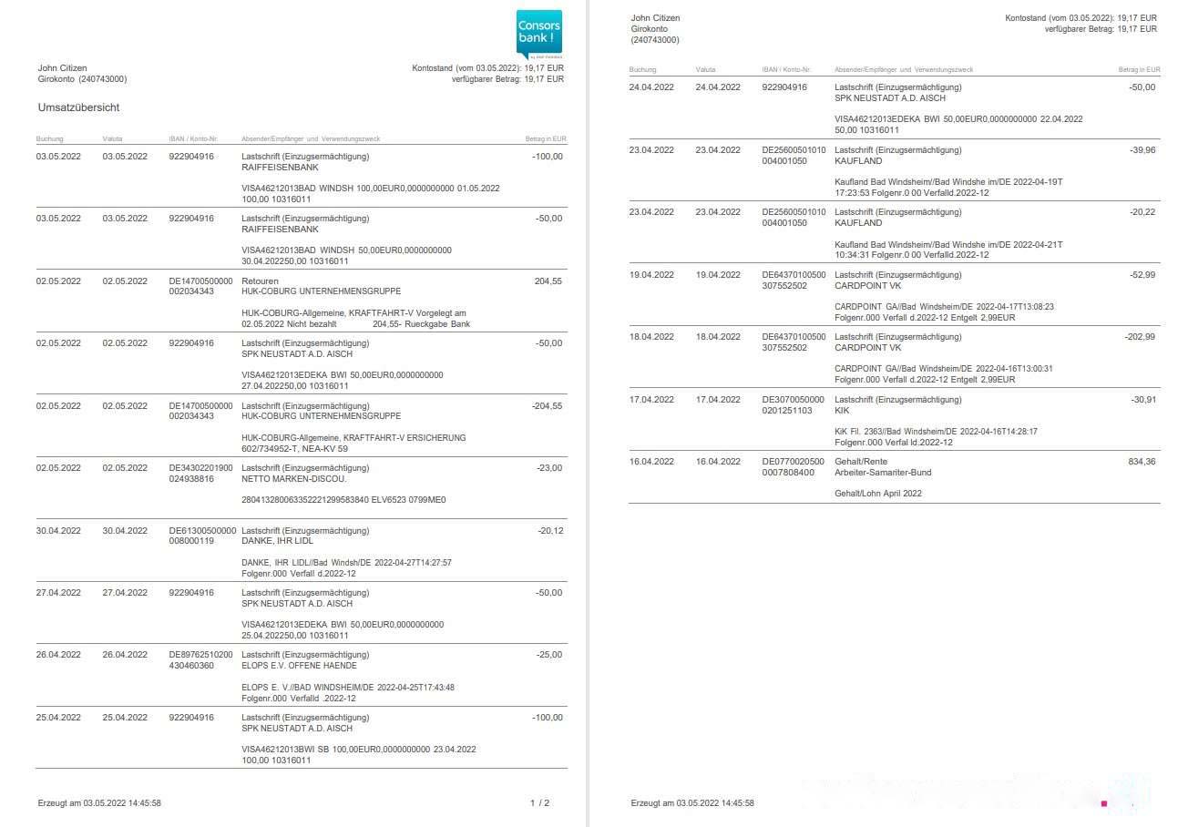 Germany Consorsbank statement 2 pages download template file